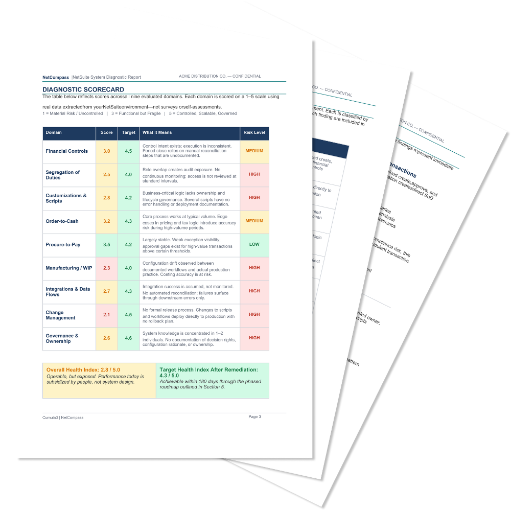 After years of customizations, user changes, and upgrades, most NetSuite environments carry risk that no one is actively watching. NetCompass uses AI to show you exactly what’s accumulated — with zero disruption.